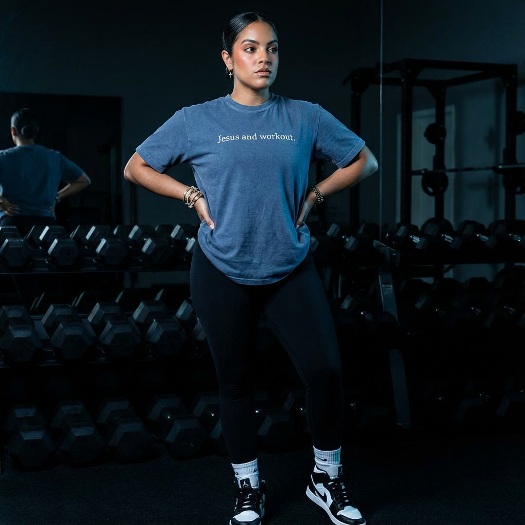 Embrace faith and fitness in one powerful statement. This denim-colored 100% cotton shirt combines comfort with faith, featuring bold "Jesus and workout" messaging that speaks to your values. Perfect for gym sessions, casual outings, or everyday wear, the soft cotton fabric keeps you comfortable while you share your passion for both spiritual growth and physical wellness. A versatile piece that lets your priorities shine.